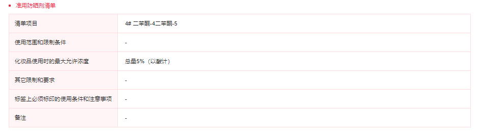 由瑞旭集團(tuán)自主研發(fā)的中國(guó)化妝品原料法規(guī)數(shù)據(jù)庫(kù)(妝合規(guī))查詢信息顯示:二苯酮-4在化妝品中用作光穩(wěn)定劑、紫外吸收劑、紫外過(guò)濾劑,已納入中國(guó)《已使用化妝品原料目錄》(2021版),列入《化妝品安全技術(shù)規(guī)范》的準(zhǔn)用防曬劑清單,用作防曬劑時(shí)二苯酮-4和二苯酮-5的最高允許使用濃度總量為5%(以酸計(jì))。